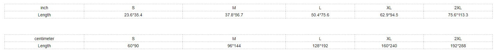 | Length | 23.6*35.4 | 37.8*56.7 | 50.4*75.6 | 62.9*94.5 | 75.6*113.3 |